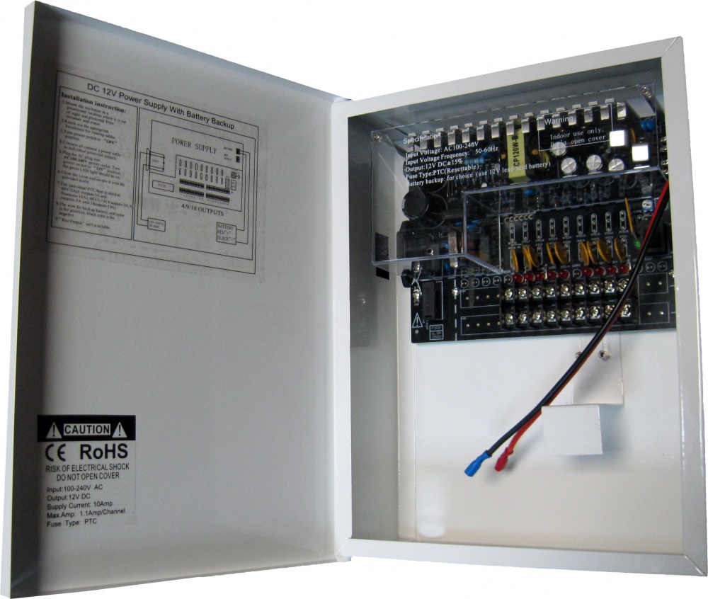 Блок бесперебойного питания, входное напряжение 9 канальный, 90-265В, выходное напряжение 12В, номинальный выходной ток 10А, защита от короткого замыкания, перегрузки, глубокой разрядки АКБ, вес нетто 1,9кг.