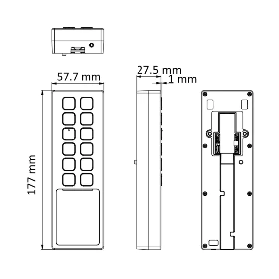 Описание <h2>DS-K1T805EX — Терминал доступа с модулем считывания карт</h2> <p>DS-K1T805EX — это надежный и функциональный терминал доступа, оснащенный встроенным считывателем EM-карт, предназначенный для использования в системах контроля доступа. Он сочетает в себе высокую степень защиты, прочную металлическую конструкцию и гибкие возможности настройки, что делает его идеальным выбором для использования в офисах, жилых комплексах и на предприятиях.</p> <p><strong>Основные особенности</strong></p> <ul> <li>Высокий уровень защиты: Степень защиты IP65 и IK08 обеспечивает устойчивость к пыли, влаге и механическим повреждениям.</li> <li>Прочная конструкция: Тонкий и гибкий металлический корпус подходит для установки в различных условиях.</li> <li>Большая емкость: Поддержка до 10 000 карт и хранение до 100 000 событий.</li> <li>Встроенный считыватель EM-карт: Обеспечивает дальность считывания до 1 см с высокой скоростью считывания (менее 1 секунды).</li> <li>Управление через мобильное приложение: Поддержка Hik-Connect позволяет удаленно управлять устройством с помощью смартфона.</li> <li>Гибкие настройки: Настройка через веб-интерфейс ПК и мобильный веб-интерфейс.</li> <li>Режимы аутентификации: Карта и PIN-код.</li> </ul> <h3>Технические характеристики</h3> <p><strong>Система</strong></p> <ul> <li>Операционная система: Linux</li> </ul> <p><strong>Аудио</strong></p> <ul> <li>Аудиовыход: Встроенный бипер для звукового оповещения</li> </ul> <p><strong>Сеть</strong></p> <ul> <li>Проводная сеть: Auto 10 / 100M Ethernet</li> </ul> <p><strong>Интерфейсы</strong></p> <ul> <li>RS-485: 1 порт с поддержкой OSDP</li> <li>Сетевой интерфейс: 1 порт</li> <li>Wiegand: Поддержка форматов Wiegand 26 / 34</li> <li>Индикатор дверного замка: 1</li> <li>Кнопка выхода: 1</li> <li>Вход дверного контакта: 1</li> <li>Тревожный вход: 2</li> <li>Тревожный выход: 1</li> <li>Защита от вскрытия (тампер): 1</li> </ul> <p><strong>Емкость</strong></p> <ul> <li>Количество карт: До 10 000</li> <li>Количество событий: До 100 000</li> </ul> <p><strong>Аутентификация</strong></p> <ul> <li>Тип карты: EM-карта</li> <li>Дальность считывания карты: От 0 до 1 см</li> <li>Скорость считывания карты: Менее 1 секунды</li> <li>Режимы аутентификации: Карта, PIN-код</li> </ul> <p><strong>Функции</strong></p> <ul> <li>Поддержка Hik-Connect: Для удаленного управления</li> <li>Настройка через веб-интерфейс: Возможность настройки через веб-интерфейс ПК и управление через мобильный веб-интерфейс</li> </ul> <p><strong>Основное</strong></p> <ul> <li>Питание: DC 12 В / 1 А</li> <li>Потребляемая мощность: ≤ 12 Вт</li> <li>Рабочая температура: От -30 до +60 °C</li> <li>Рабочая влажность: От 0 до 90 % (без конденсата)</li> <li>Размеры: 57.7 × 177 × 34.6 мм</li> <li>Поддержка языков: Русский, английский, французский, испанский, итальянский, арабский, украинский и другие</li> </ul> <p>DS-K1T805EX идеально подходит для использования в офисах, жилых комплексах, на предприятиях и в других местах, где требуется надежная система контроля доступа с высоким уровнем защиты и удобным управлением.</p>